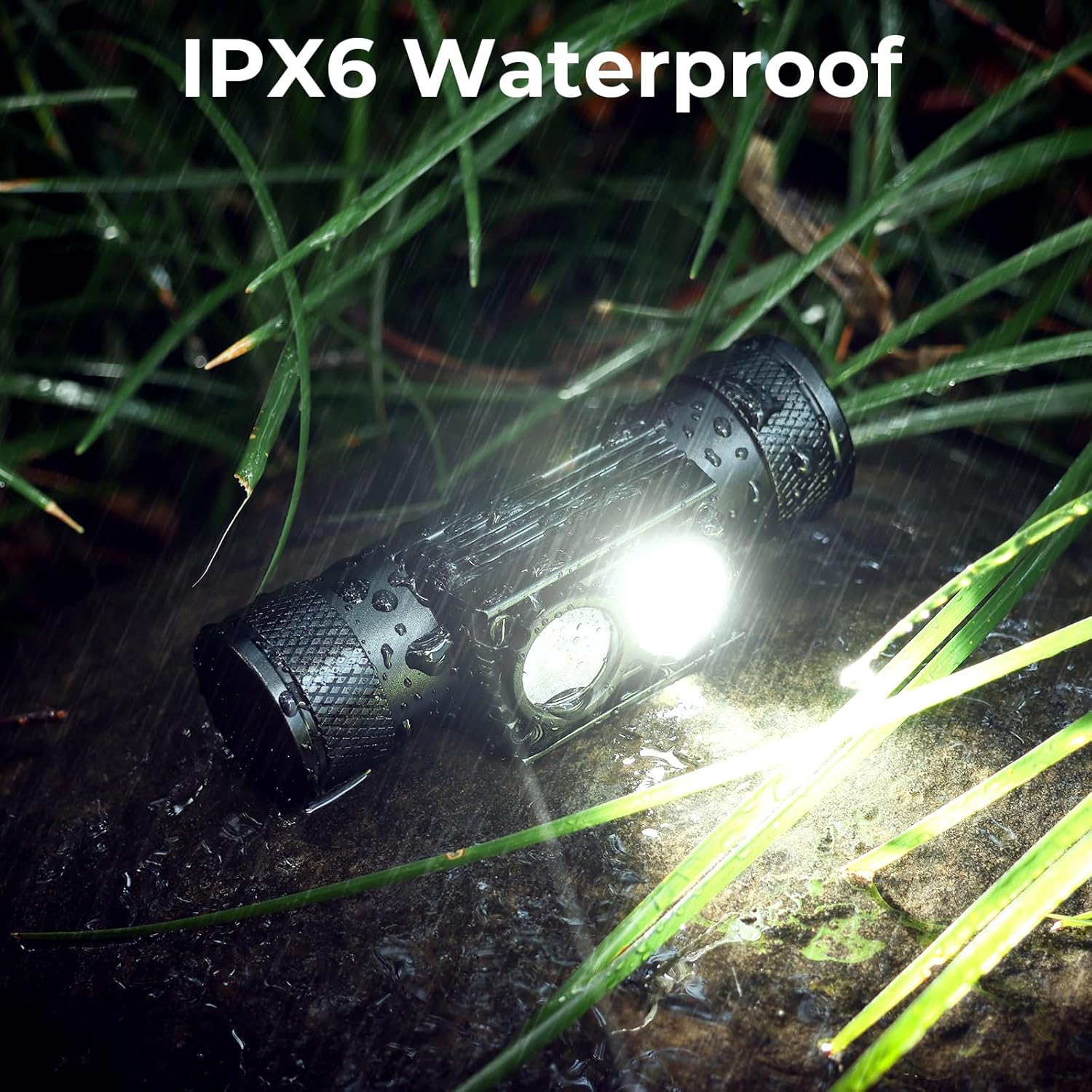 Build Quality: Constructed from aircraft-grade aluminum with hard-anodized anti-abrasive finish, the rechargeable headlamp is built to endure rough handling. IPX6 rated waterproof makes the headlamp have protection against liquid intrusion