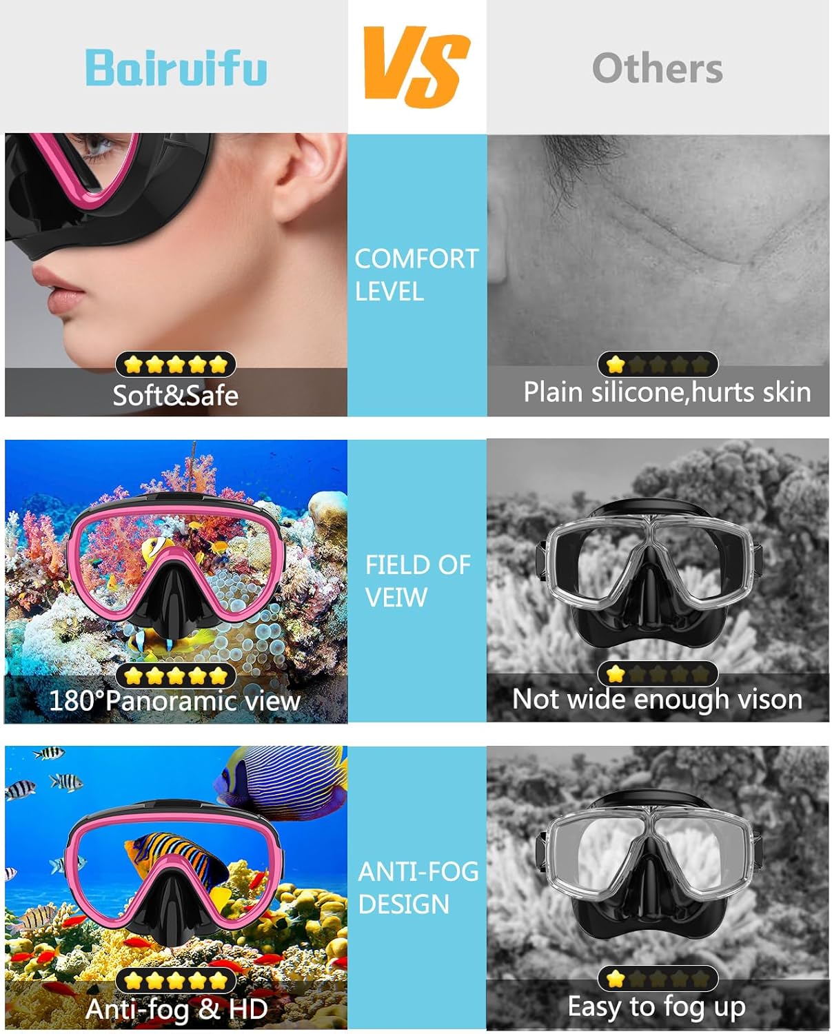 I picked up the Bairuifu 2-pack snorkel set for a beach trip, and overall I’m pretty happy with it. The masks fit comfortably, the silicone skirt seals well, and the tempered glass lenses give a nice clear view underwater. The dry-top snorkel works as advertised — it blocks water when you dip under, which makes snorkeling less stressful, especially for beginners.I like that it comes as a 2-pack since it’s perfect for sharing or having a backup. The build feels decent for the price, and the set packs down well for travel.That said, it’s not perfect. Like most masks, if you don’t get the fit right (or have facial hair), you can get small leaks. Fogging can also happen despite the anti-fog claims, so a little prep before swimming helps. And while the snorkel valve is good, it’s not flawless in choppy waves — a bit of water can still sneak in.Overall, for casual snorkeling and vacations, this set is great value. Comfortable, clear, and beginner-friendly. If you’re planning heavy or frequent use, you might want to invest in a higher-end mask later, but for most people this works really well.