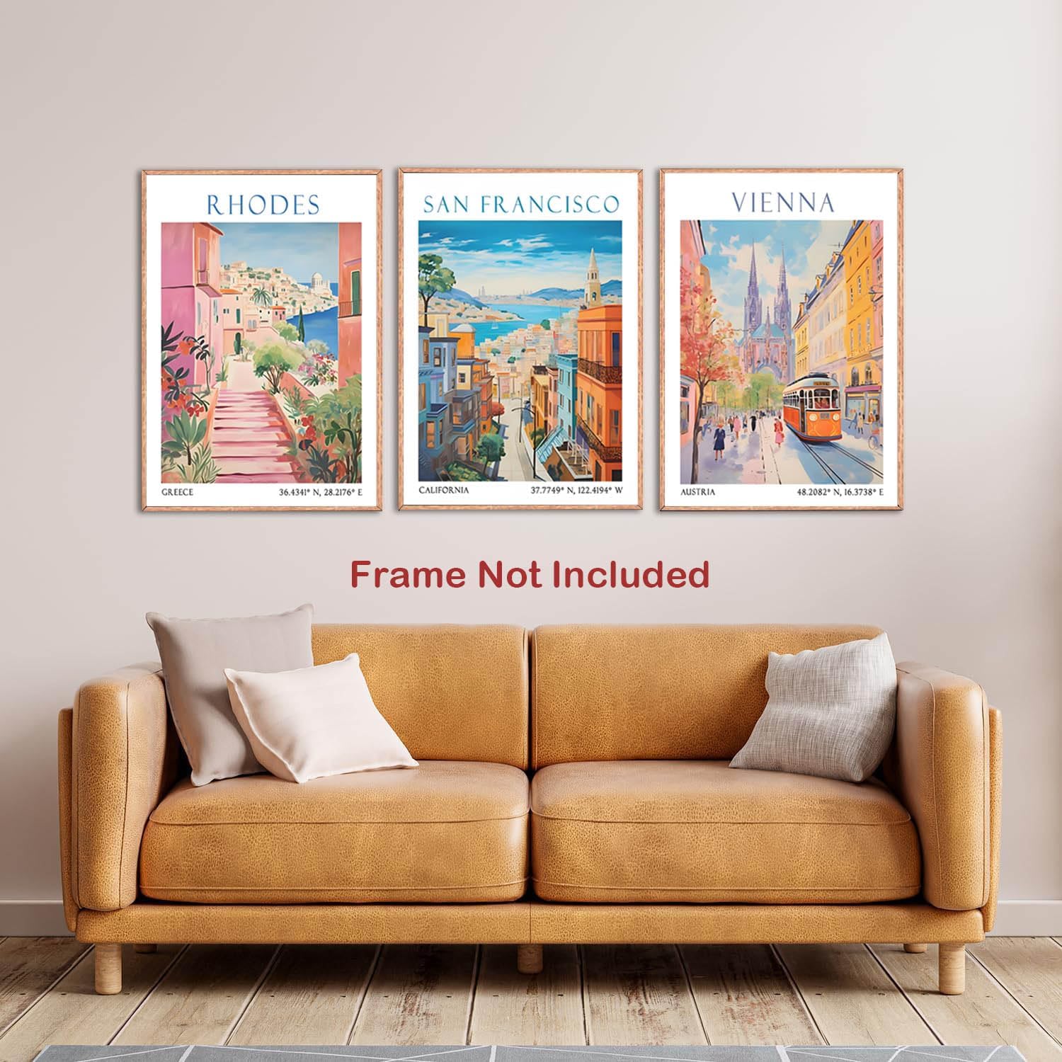 Bring Iconic Destinations Into Your Home: This Vintage Travel Wall Art Set features stunning depictions of Rhodes, Vienna, and San Francisco, perfect for adding a touch of global charm to your living room, bedroom, or bathroom.