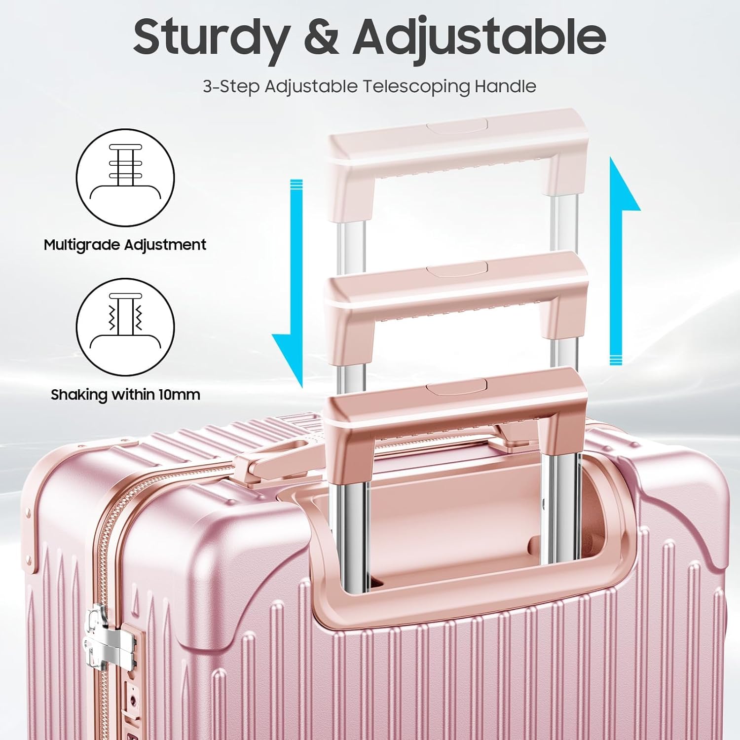 【Adjustable Telescopic handle carryon】Hardside Suitcase with Smart Luggage, With adjustable multi level telescopic pull rod, it conforms to ergonomics and adapts to different height requirements,making your journey more effortles