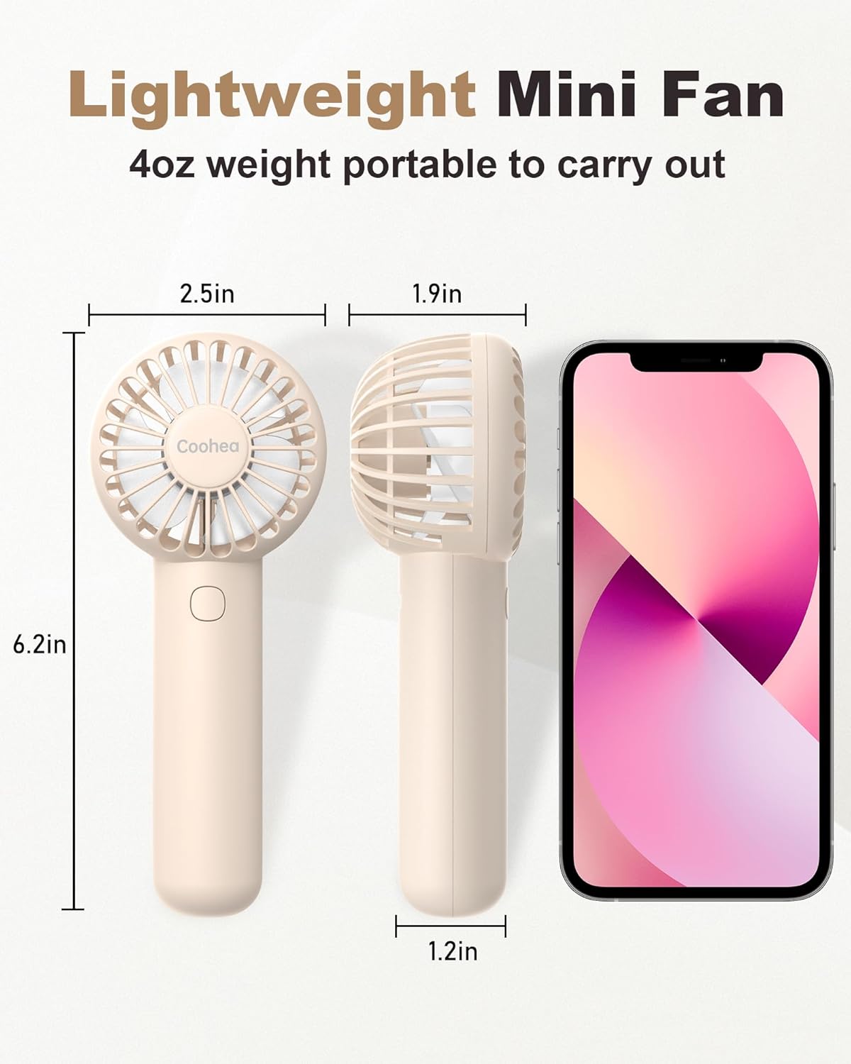 Mini Handheld Fan: Coohea portable fan is 2.5*1.9*6.2 inch in size and 4 ounce in weight, which is compact to fit in cosmetic bag/ pocket and lightweight to carry out. A great companion for eyelash extension, makeup, travel, trip, beach in summer