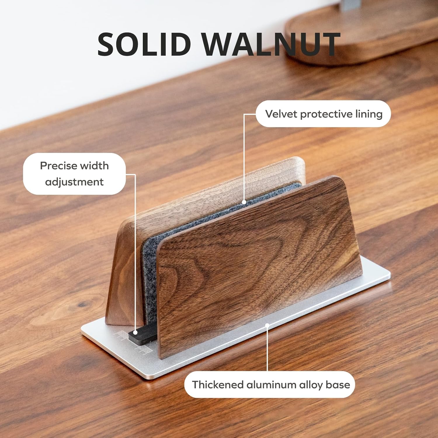 The walnut stand comes with a protective pad on the inside to protect your laptop from scratches and a non-slip pad on the bottom to ensure that the stand is very stable on any desktop.