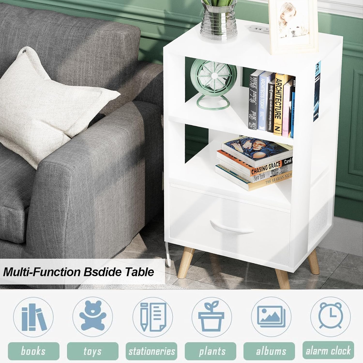 【3 tiers of space for storage】The dimensions of the white end table for living room are 15.74″ W x 11.81″ D x 28.66″ H, and the dividers have a weight capacity of 25 lbs. This 3-tier kids bedside table with charging station has a variety of storage features, whether it’s books, magazines, remotes, etc. that can be neatly stored in it.