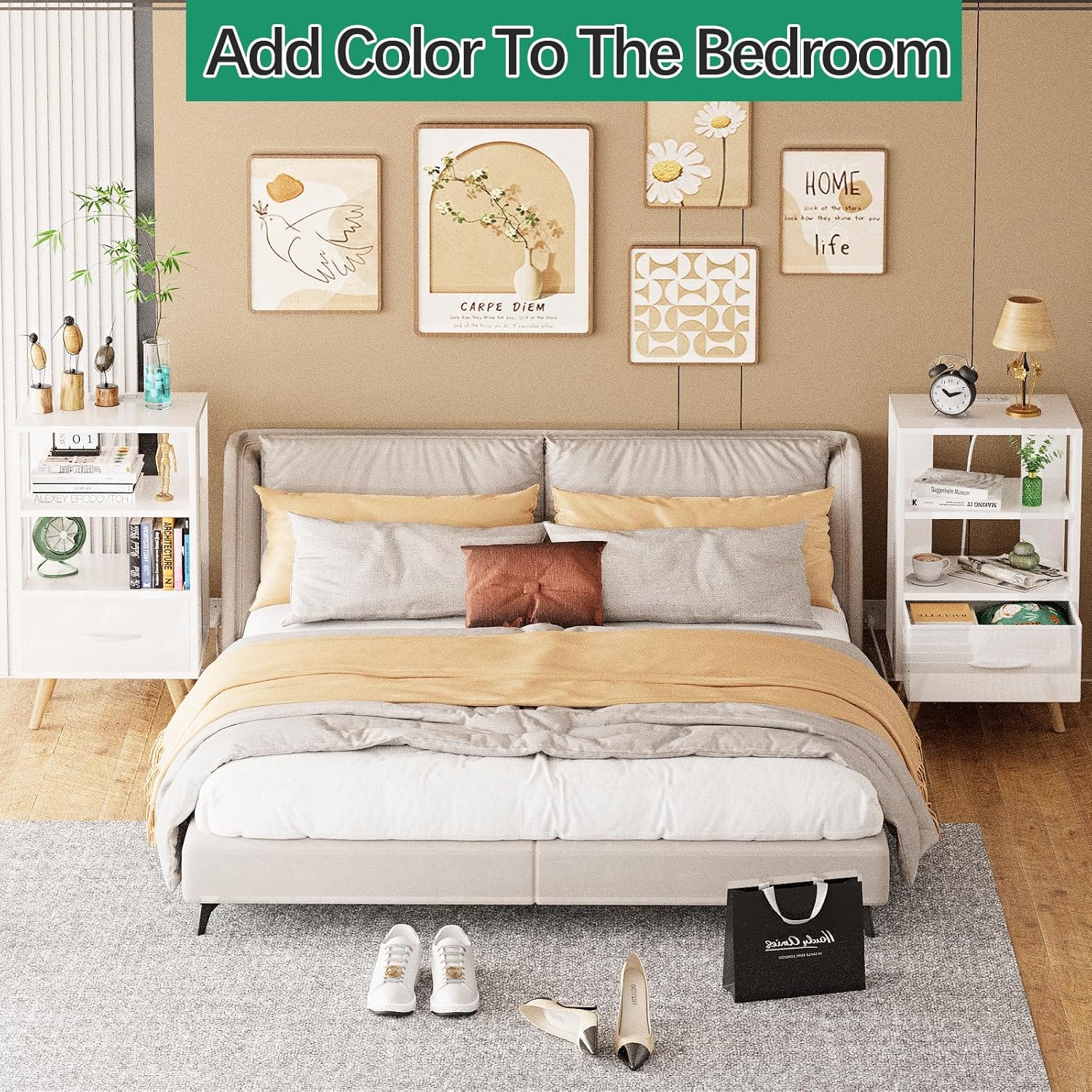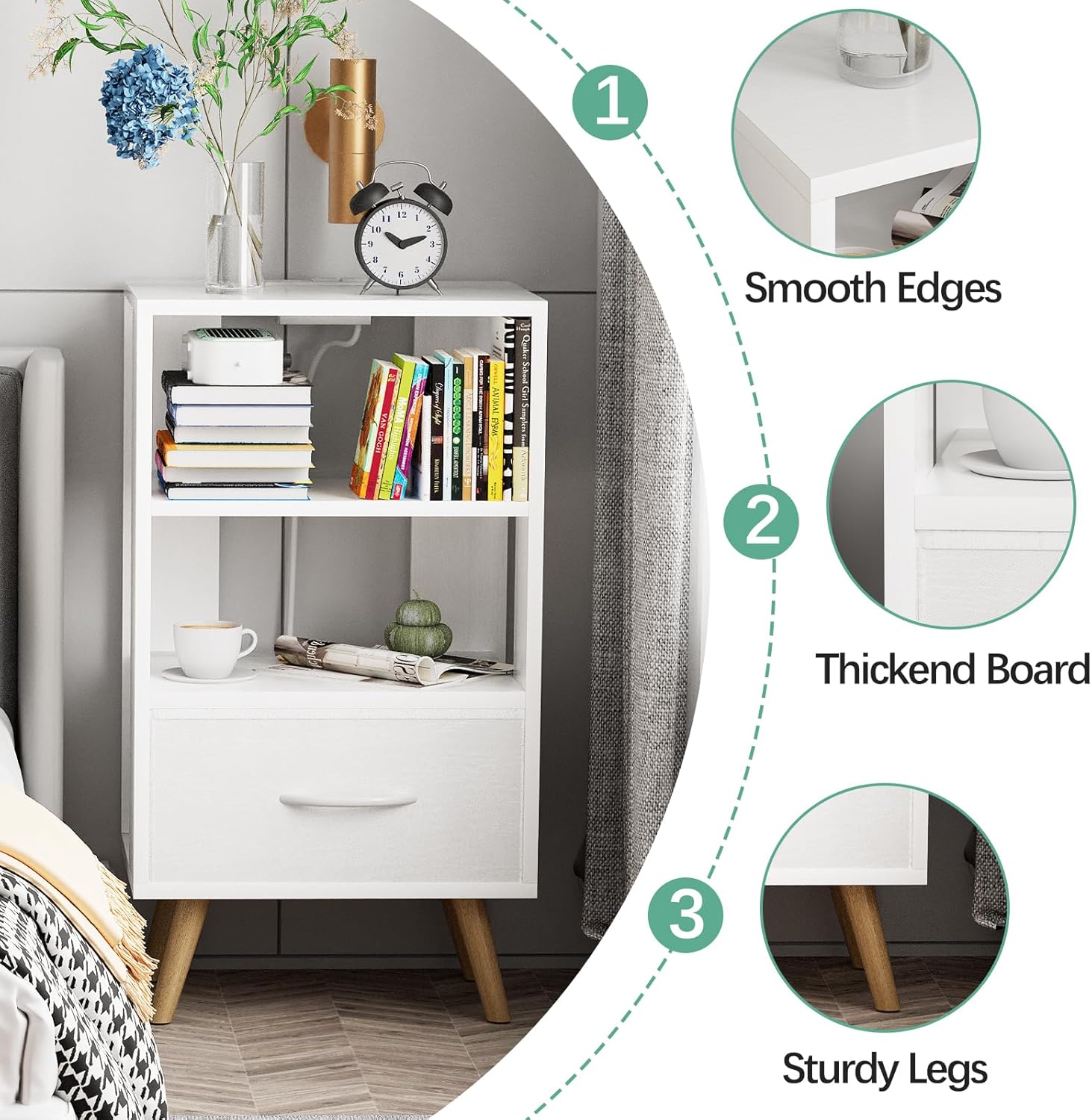 【Sturdy material】High-quality MDF creates the small nursery side table that is supportive and durable. A tactile, fine-grained woodgrain veneer adds to the charm of this end table for small spaces. Four wooden legs at the bottom add to the sturdiness of this nightstand.