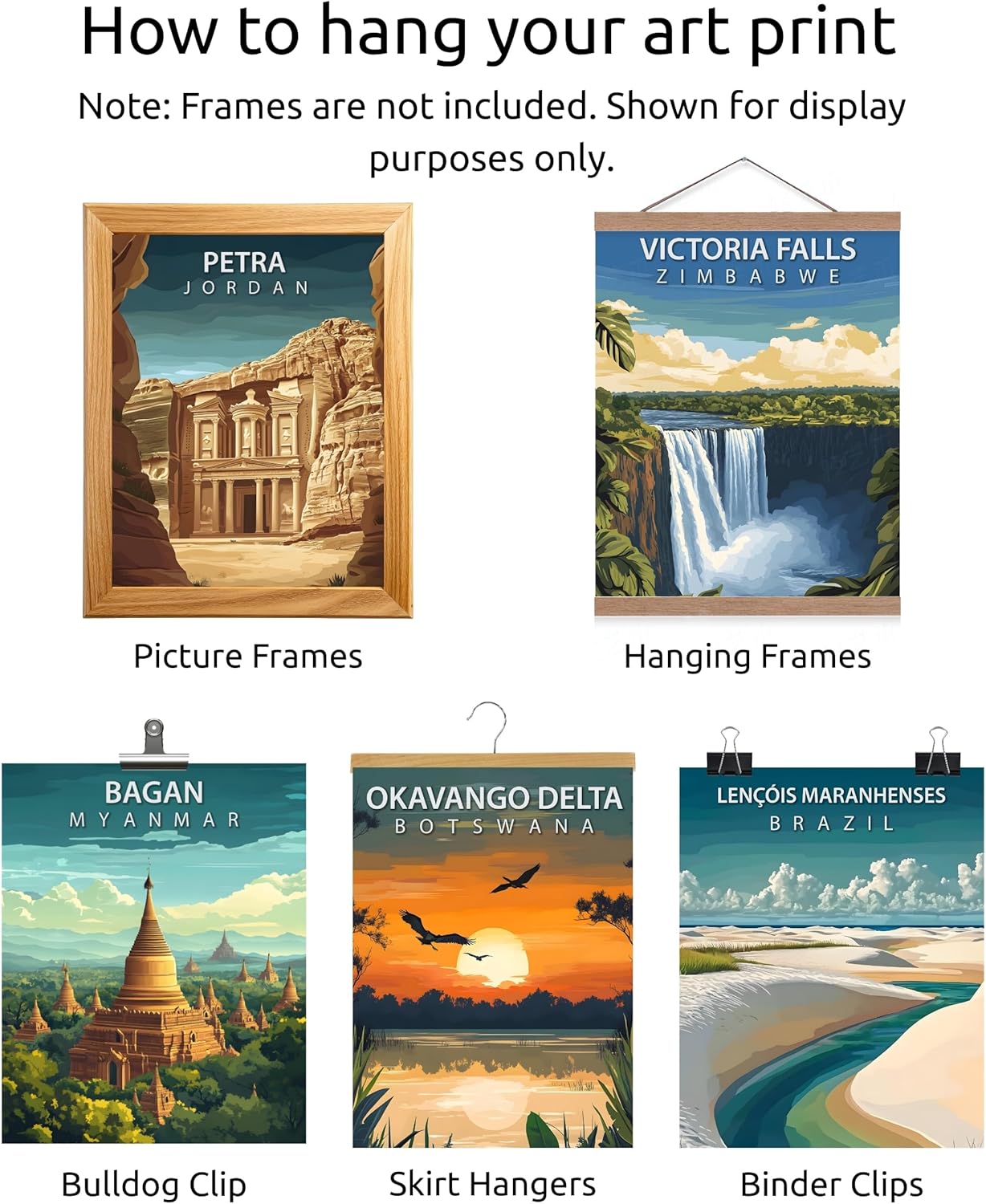 Transform your walls with this Set of 9 Travel Posters featuring breathtaking world destinations: Petra, Pamukkale, Okavango Delta, Victoria Falls, Bagan, Avenue of the Baobabs, Blue Lagoon, Rocky Mountains, and Lençóis Maranhenses. Each print measures 8×10 inches and is crafted on premium 350gsm cardstock with fade-resistant, high-quality color printing for a stunning and durable finish. Perfect for living rooms, bedrooms, offices, or as a thoughtful gift for travel lovers. These prints are shipped unframed, allowing you to style them with frames, hangers, or clips to match your decor. Create your own gallery wall and bring the beauty of world wonders into your home.