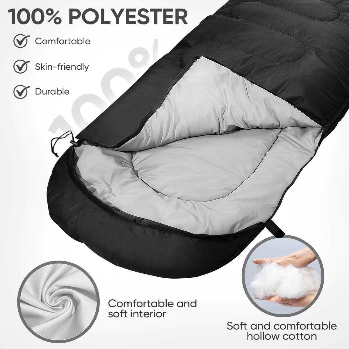 Comfortable, durable and skin-friendly-100% polyester lining is skin-friendly and comfortable. High-quality polyester makes it durable. No matter how hard and rugged the ground is, you will feel comfortable. They are very spacious for any adult or child. It’s easy to get in and out and turn around to find a comfortable sleeping position.