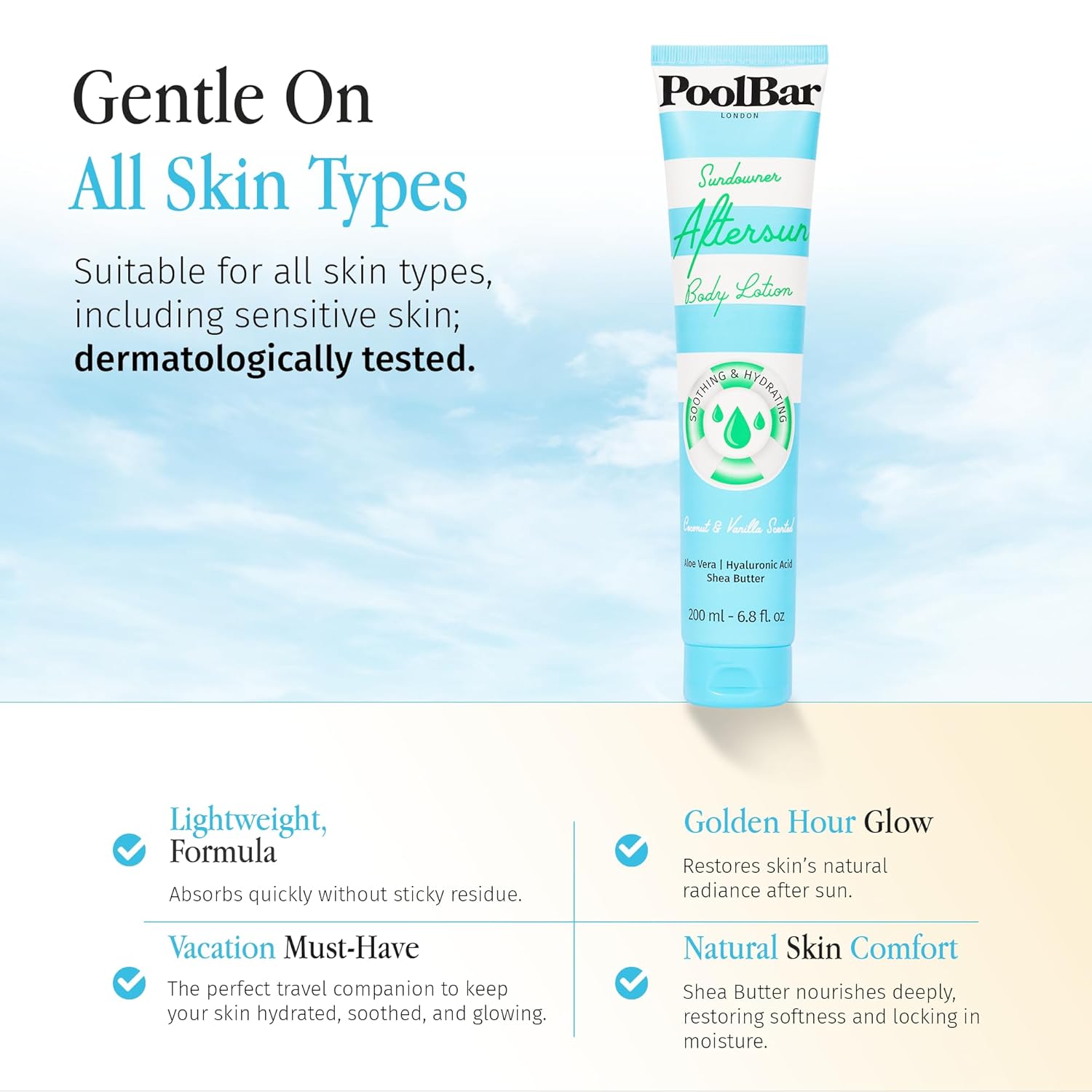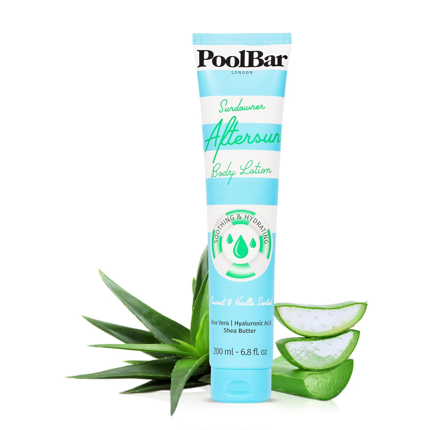 PoolBar Sundowner Aftersun Body Lotion for Women and Men Skin Care, Hydration and Soothing Relief Coconut & Vanilla Scent Sun Care, Enriched with Hyaluronic Acid, Shea Butter, and Aloe Vera, 200ml